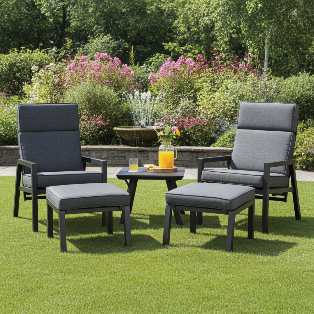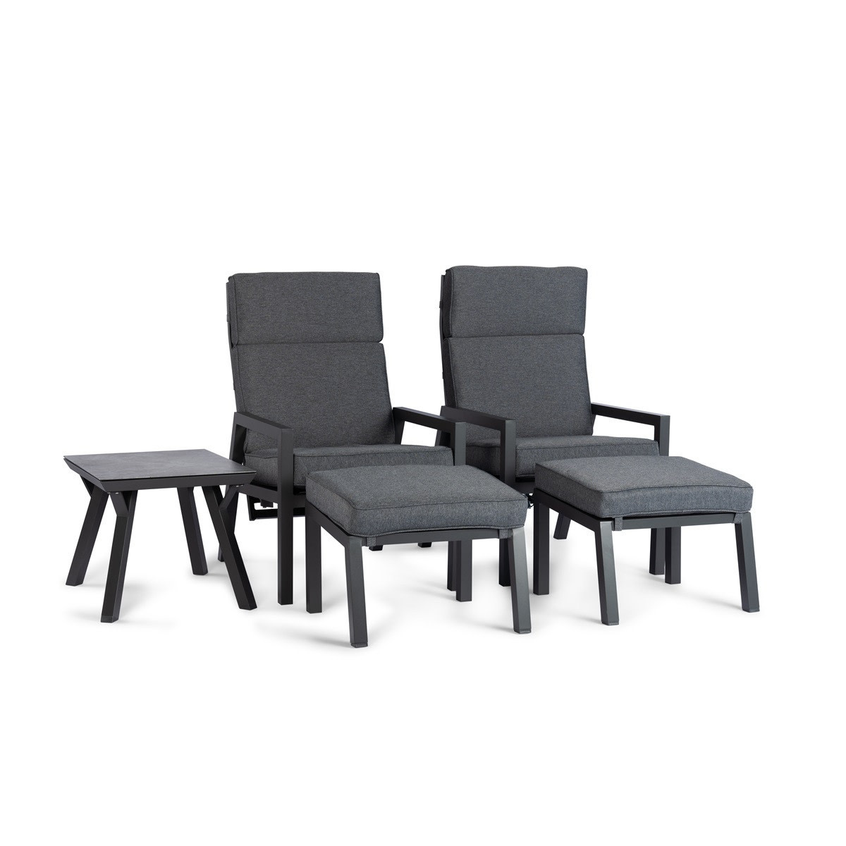 The Campo 5-piece lounge set combines comfort and style in a contemporary design, crafted from durable materials. This set includes 2 adjustable chairs with Swiss Fabric, 2 ottomans/footstools, and a square side table with a ceramic top. The high-quality Swiss Fabric provides a luxurious, weather-resistant finish, while the ceramic tabletop is both stylish and low-maintenance.