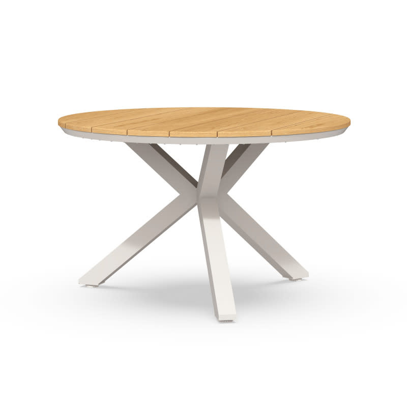 De Orbital tafel heeft een frame gemaakt van aluminium met een WIT gekleurde epoxy coating. Aluminium corrodeert niet, het is klaar voor gebruik bij elke type weer, en is dus ook geschikt in de buurt van de zee! Het blad van de tafel is van Teakhout (FSC) en geeft de tafel de warme uitstraling van natuurlijk hout mee. Om de natuurlijke kleur van het hout te houden raden wij aan het hout geregeld te behandelen met een teakreiniger in combinatie met teak olie of teak oil sealer.